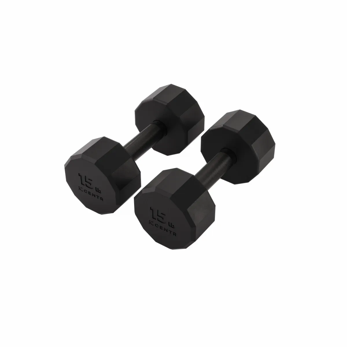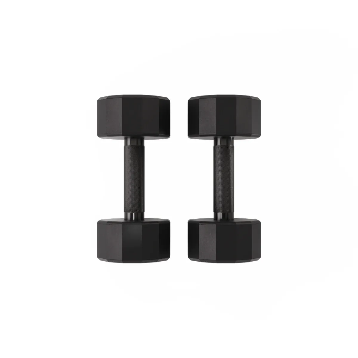 Elke dumbbell heeft een 12-zijdige rubberen kop die voorkomt dat de gewichten wegrollen en tegelijk je vloer beschermt tegen krassen en deuken. De licht gebogen stalen handgrepen met comfortabele griptextuur geven optimale controle bij elke herhaling — van snappy curls tot zware presses.