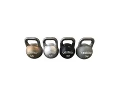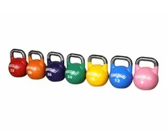 - Competition kettlebell: deze kettlebells zijn uniek doordat alle kettlebells uit een serie exact dezelfde afmetingen hebben, ongeacht het gewicht. Een 4 kg kettlebell heeft dus dezelfde afmetingen als een 24 kg kettlebell. Deze kettlebells zijn gemaakt van staal