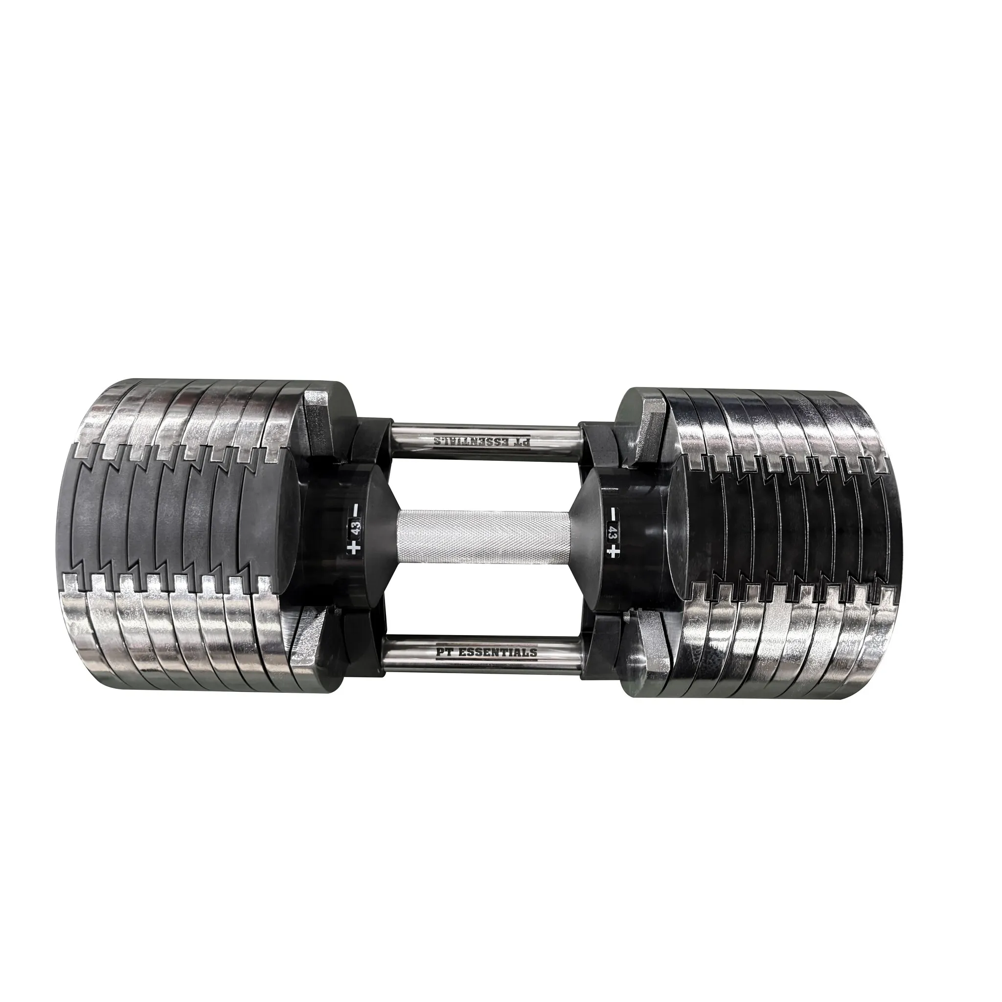 De PTessentials verstelbare dumbbells vervangen meerdere losse halters door één handige set die kan worden aangepast van 2 tot 24 kilo of 5,5 tot 43 kg. Dankzij het compacte ontwerp heeft u geen groot opbergrek meer nodig, en kunt u moeiteloos schakelen tussen verschillende gewichten zonder uw focus te verliezen.