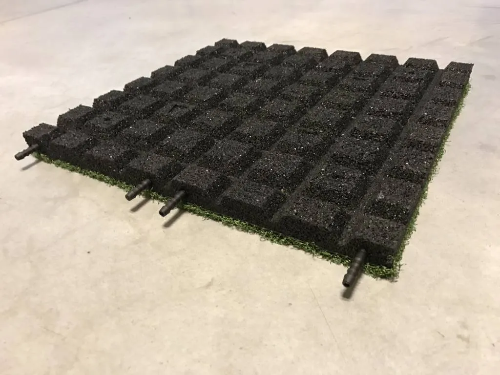 Deze rubberen Sportgras tegel heeft een onderlaag met blokkentextuur waardoor het uitstekend water kan afvoert. Dit zorgt er voor dat de tegels eenvoudig water door laten en dus tegen een hevige regenbui kunnen.